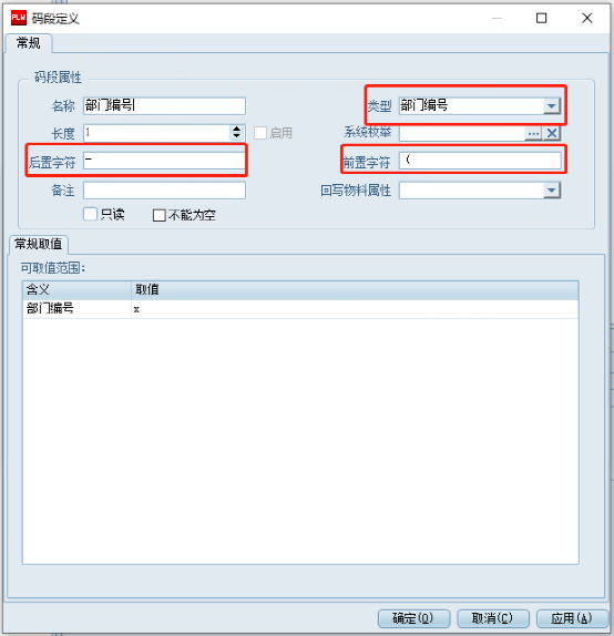 所以第二个码段的类型选择“部门编号”,并且把前置字符与后置字符设置好:
