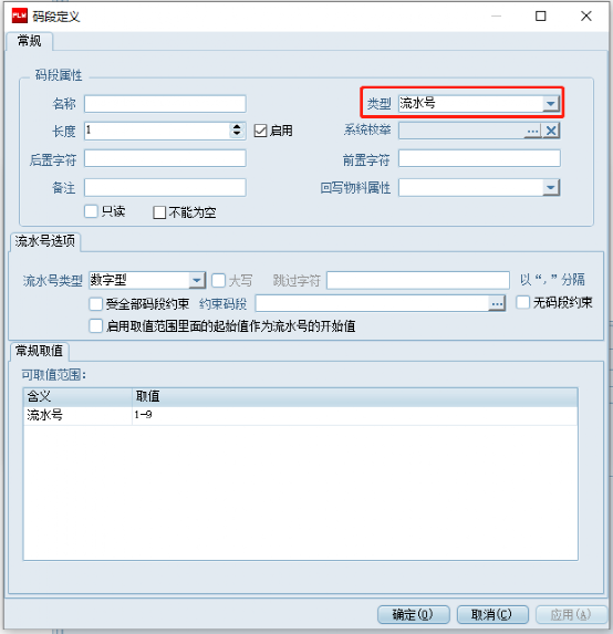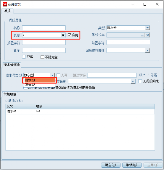 故码段类型选择“流水号”,设置“长度”为1位,流水号类型是“数字型”: