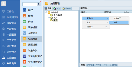 在“企业配置”大模块下的“编码管理”子模块中,选取文件夹(例如下图中的“演示”文件夹),在“编码列表”区中【右键】>【新建】>【编码】: