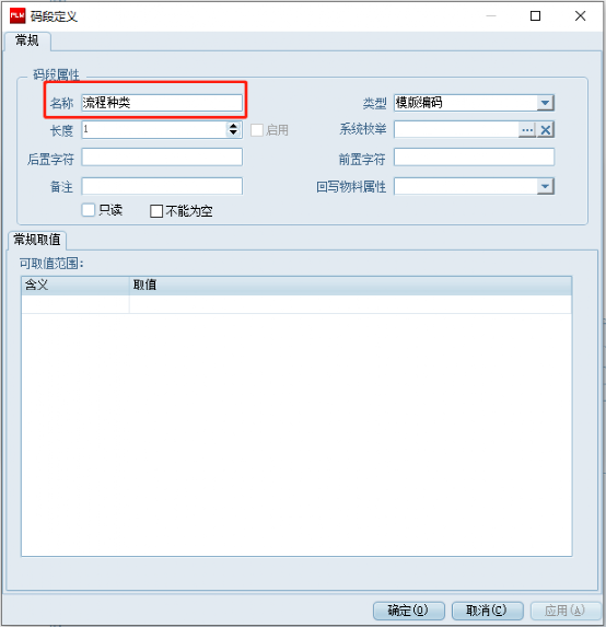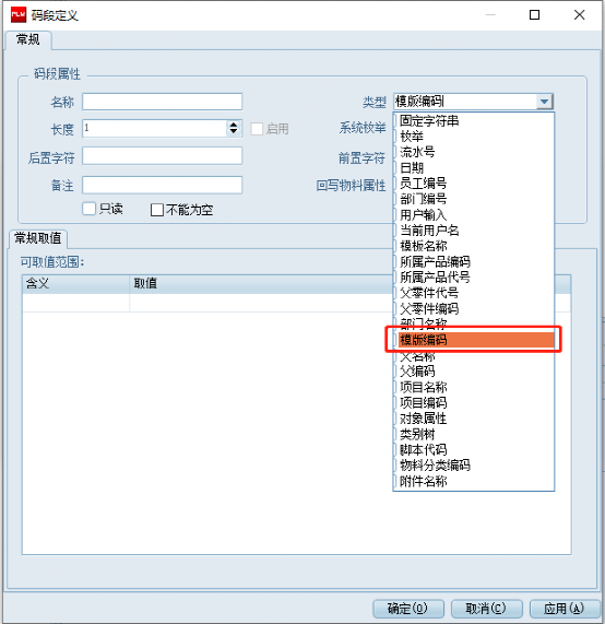 对于PLM管理系统而言,流程种类就是流程模板的名称,故码段类型选择“模板名称”,这样在创建实例的时候,系统会自动把流程模板名称输入此码段: